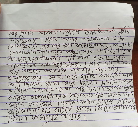 চুরির ৪ বছর পর চোরের অনুসচনায় চিঠি সহ মোবাইল ফেরত দিলেন ব্যাংক কর্মকর্তা কে