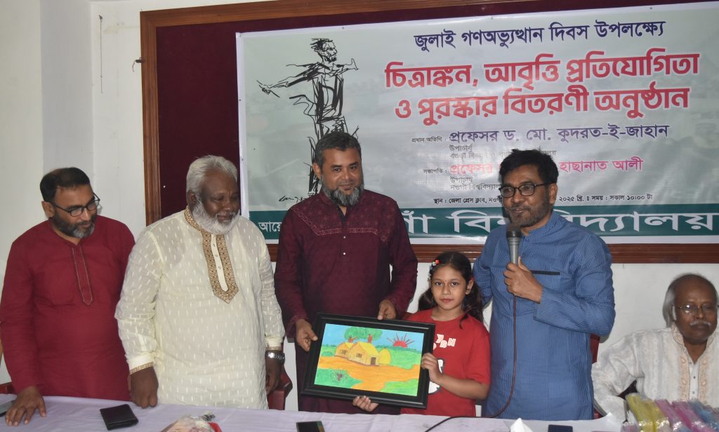 জুলাই গণঅভ্যুত্থান দিবস উপলক্ষে নওগাঁয় চিত্রাঙ্কণ, আবৃত্তি প্রতিযোগিতা ও পুরস্কার বিতরণ অনুষ্ঠান অনুষ্ঠিত হয়েছে। মঙ্গলবার সকাল ১০ টার সময় নওগাঁ জেলা প্রেসক্লাব অডিটোরিয়ামে নওগাঁ বিশ্ববিদ্যালয়ের আয়োজনে চিত্রাঙ্কন ও আবৃত্তি প্রতিযোগিতা অনুষ্ঠান শুরু হয়। পরে দুপুরে বিজয়ী ও অংশগ্রহণকারী শিশু-কিশোরদের মাঝে পুরষ্কার তুলে দেওয়া হয়।