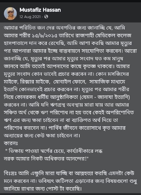 নিহত নওগাঁ জেলা গোয়েন্দা পুলিশের(ডিবি) ভারপ্রাপ্ত কর্মকর্তা মো: মোস্তাফিজ হাসান ২০১৫ সালের ১২ আগষ্ট তার ভেরিফাইড ফেসবুক থেকে একটি মানবিক স্ট্যাটাস দিয়েছিলেন। সেই সময় স্ট্যাটাসটি তেমন সাড়া না ফেললেও মৃত্যুর পর স্ট্যাটাসটি অনেকের দৃষ্টি আকর্ষন করেছে। অনেকেই স্ট্যাটাসটি বার বার পড়ছে।